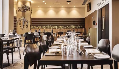 The Treble Suite is a brand new hospitality experience at Old Trafford. Situated within the Sir Bobby Charlton stand, above the historic Munich Tunnel, you and your guests can enjoy the elegant surroundings whilst dining on a five-course culinary experience.
